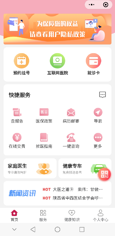 除原有預(yù)約掛號、互聯(lián)網(wǎng)醫(yī)院、查報告、電子就診卡、院內(nèi)導(dǎo)航等服務(wù),本次更新新增健康專車、家庭醫(yī)生等便捷功能。讓您享受就醫(yī)一站式全流程。
